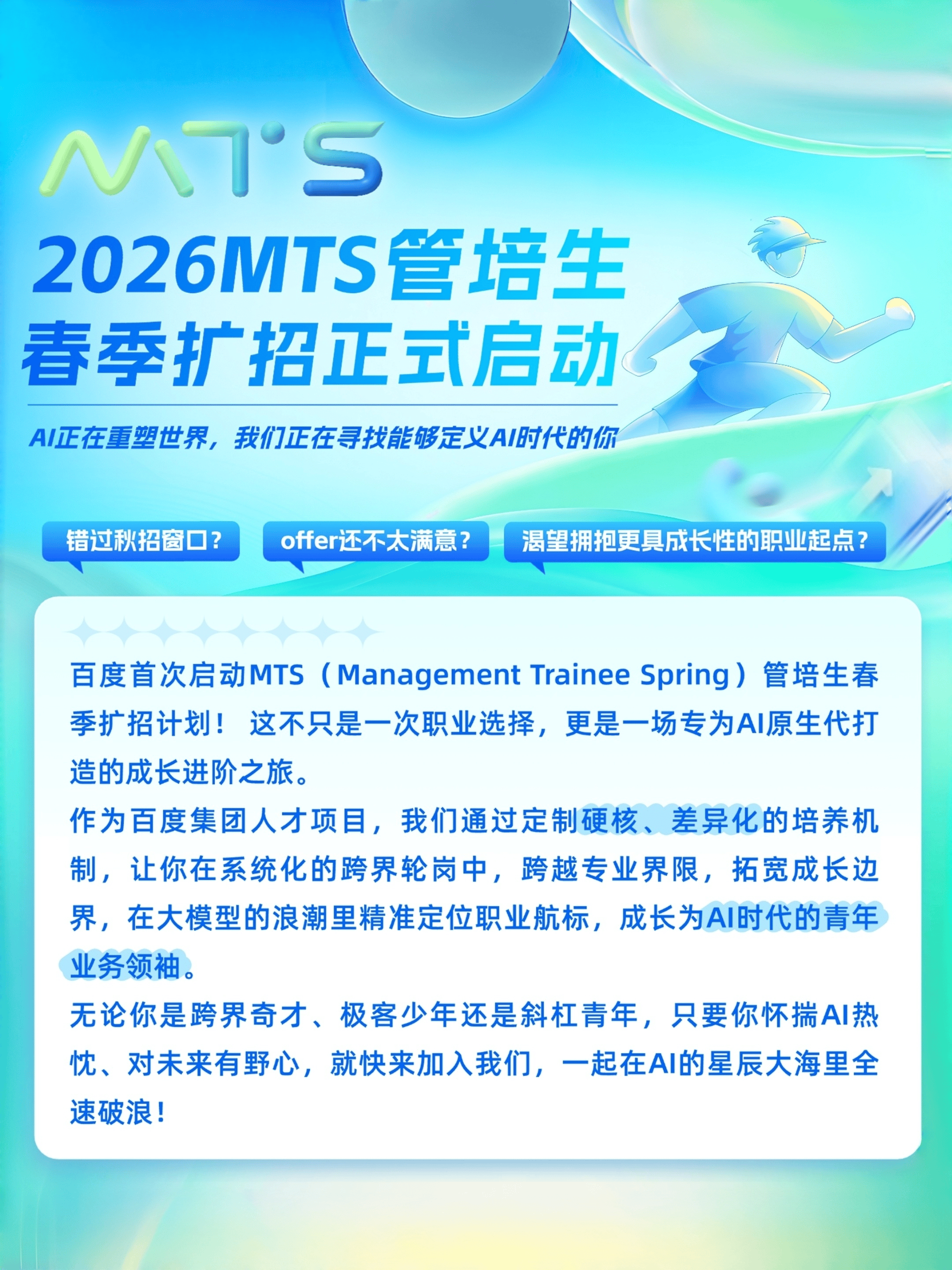 百度近日宣布启动2026届MTS(Management Trainee Spring)管培生春季扩招计划,这是其顶尖人才项目首次将录用名额翻倍,旨在为AI时代储备更多年轻领军者。根据招聘方案,新一批管培生将接受为期两年的定制化培养,涵盖产品、研发、战略等六大核心领域,并由集团高管直接指导轮岗实践。
