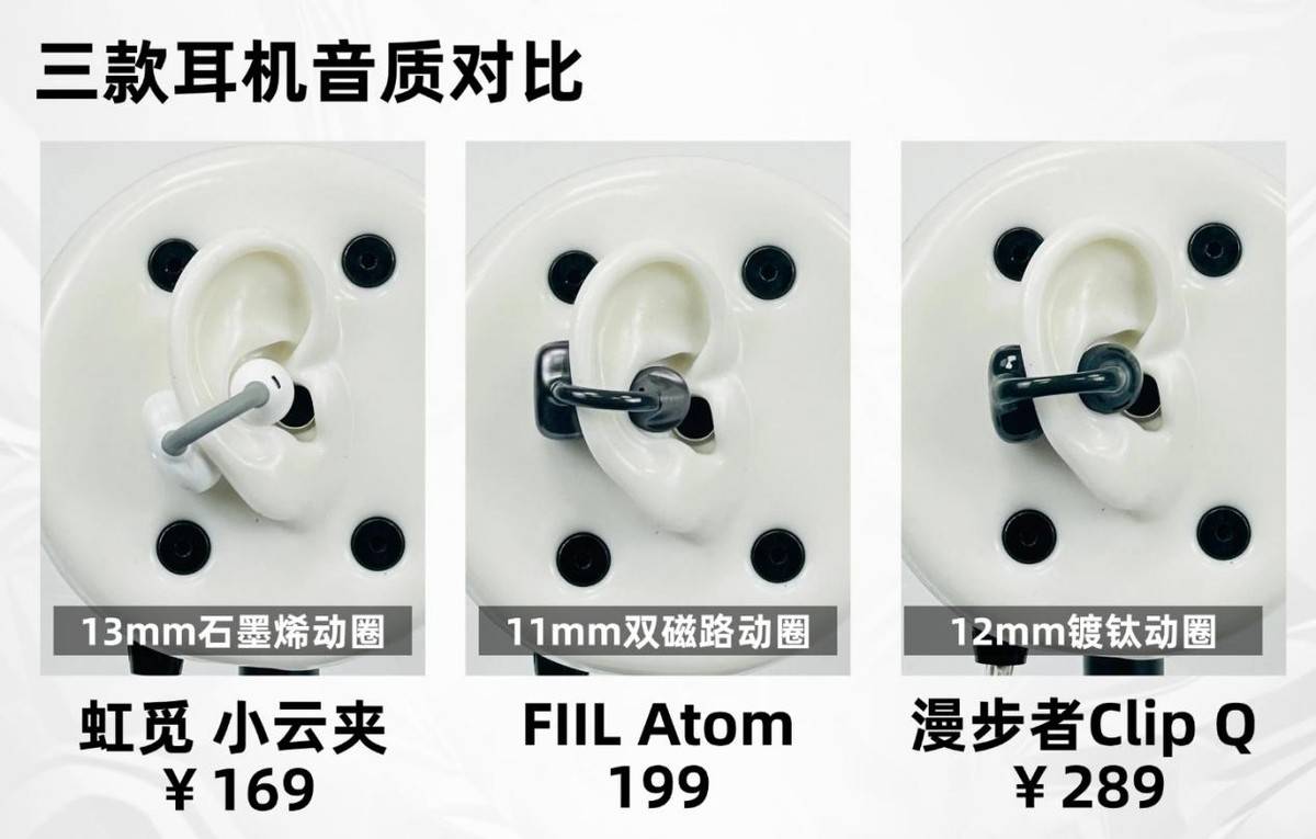音质表现呈现明显分层。虹觅小云夹搭载13毫米石墨烯振膜单元,凭借材料的高形变能力实现声音细节还原,配合H-zone全景空间音效技术,在声场拓展与氛围营造上表现突出。FIIL Atom的11毫米双磁路单元解析力尚可,但低频量感不足与高频单薄的问题在复杂乐章中尤为明显。漫步者Clip Q的12毫米钛度复合振膜在中频人声呈现上具有优势,适合播客与流行音乐,但低频下潜不足与音量增大后的漏音问题限制了使用场景。