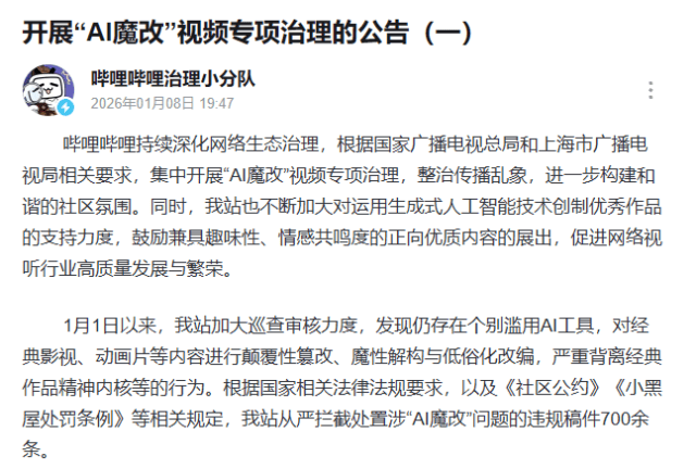 国家广播电视总局近日宣布,自2026年1月1日起,全国范围内启动为期一个月的“AI魔改”视频专项整治行动,重点打击利用四大名著、历史题材、革命题材及英模人物等经典影视作品进行不当AI改编的内容。截至1月8日,多家主流网络视听平台已公布首周治理成果,累计清理违规内容超5000条。