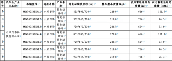 工信部最新公布的《减免车辆购置税的新能源汽车车型目录(第二十七批)》中,新一代小米SU7的详细技术参数首次对外披露。这款备受关注的新能源轿车将推出三种不同容量的电池组配置,分别为73kWh、96.3kWh和101.7kWh,对应CLTC工况下的综合续航里程覆盖630公里至902公里区间。