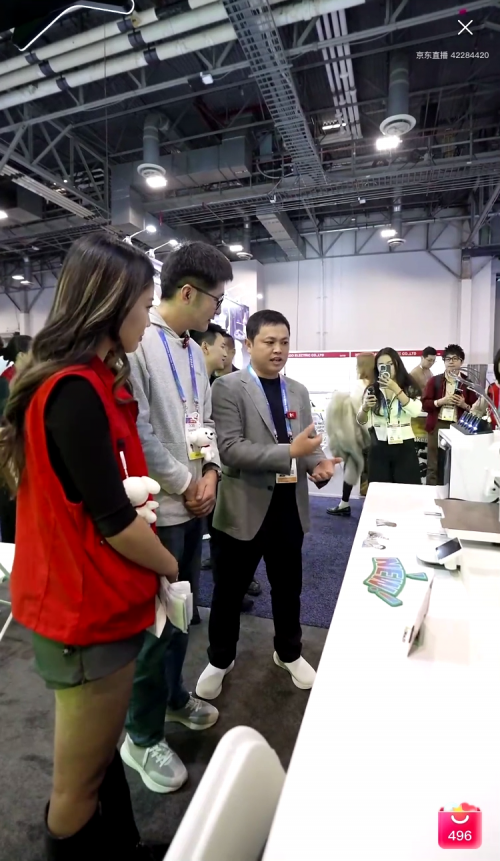 创想三维联合创始人唐京科(右一)在CES跟影视飓风Tim(右二)讲解 SPARKX i7