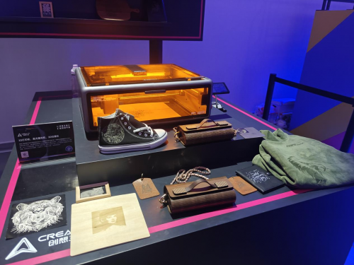 而在另一侧,激光雕刻机 Creality Falcon A1 Pro 则展示了对不同材质的驾驭能力。现场摆放的展品涵盖了纹理细腻的帆布鞋、质感十足的皮包以及精美的木刻画和吊牌。这种在皮革、木材、织物等多种材质上进行精准刻画的能力,为个人工作室或手工爱好者提供了更多定制化创作的可能。