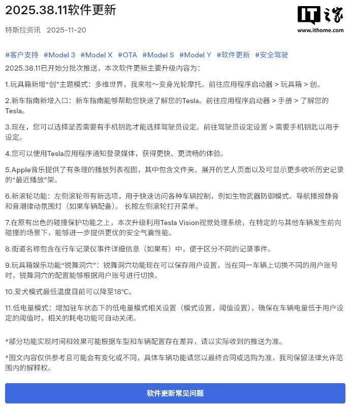 特斯拉中国近日面向Model 3、Model Y、Model S及Model X全系车型启动2025.38.11版本软件分批推送,此次更新涵盖驾驶安全、娱乐交互、车辆控制等十余项功能升级,为用户带来更智能化的用车体验。