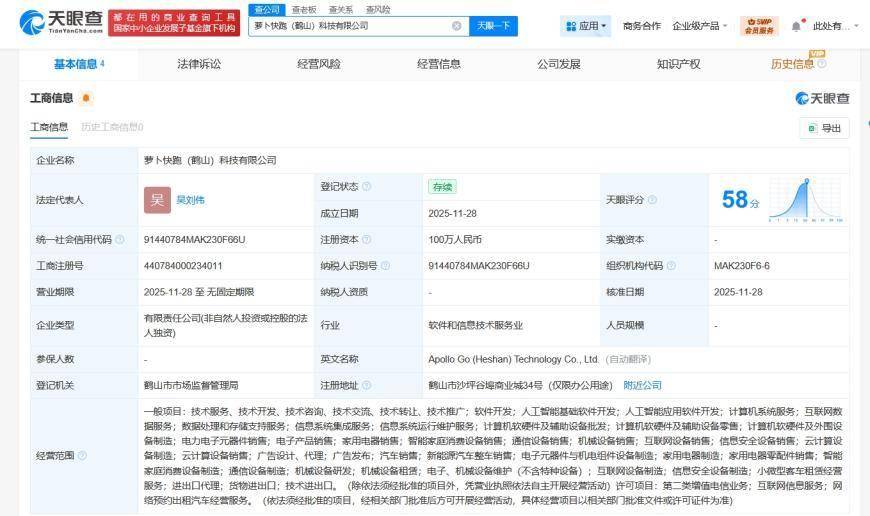 一家名为萝卜快跑(鹤山)科技有限公司的新企业近期完成工商注册登记,正式进入市场视野。据公开信息显示,该公司法定代表人为吴刘伟,注册资本设定为100万元人民币,由萝卜运力(北京)科技有限公司全资控股。