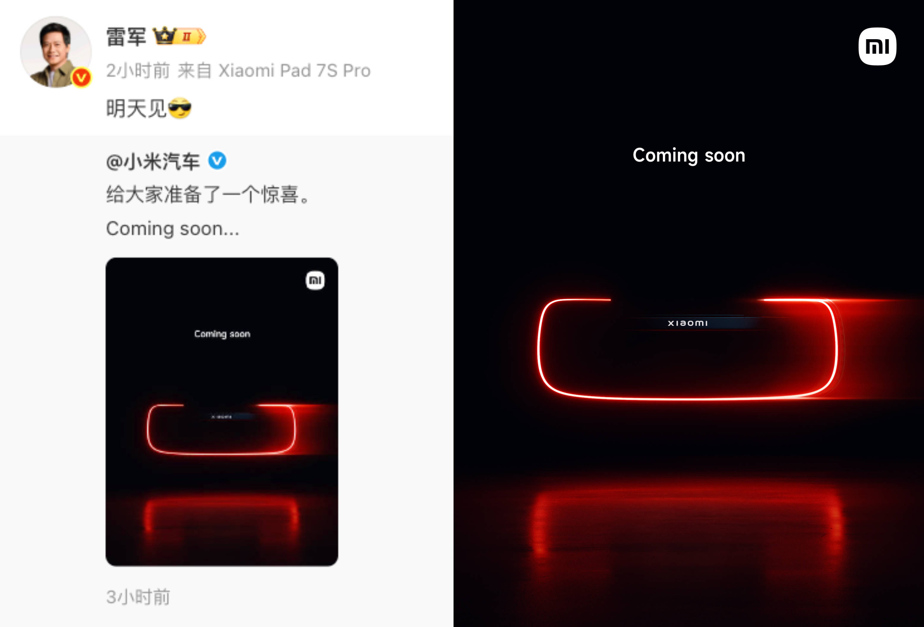 今日一早,小米汽车突然发布预热海报,宣布新车即将登场,雷军在海报下方留言“明天见”,瞬间引发广泛关注与热议。海报中透露的信息有限,仅展示了一组独特的圆弧形灯以及“xiaomi”的logo。不过,从灯光与地面极近的距离来看,这显然不是传统家用车或SUV的风格,结合个性的灯光设计,有猜测认为这可能是一款低趴的跑车。