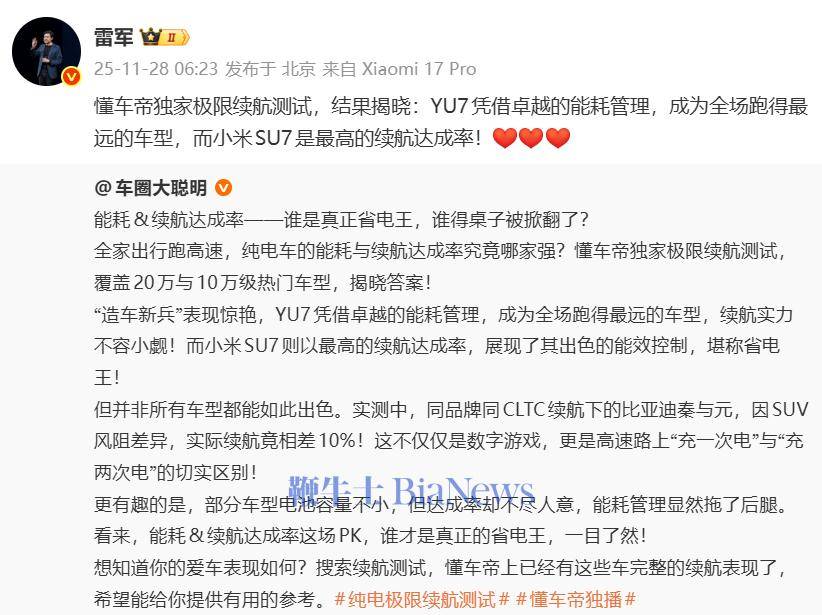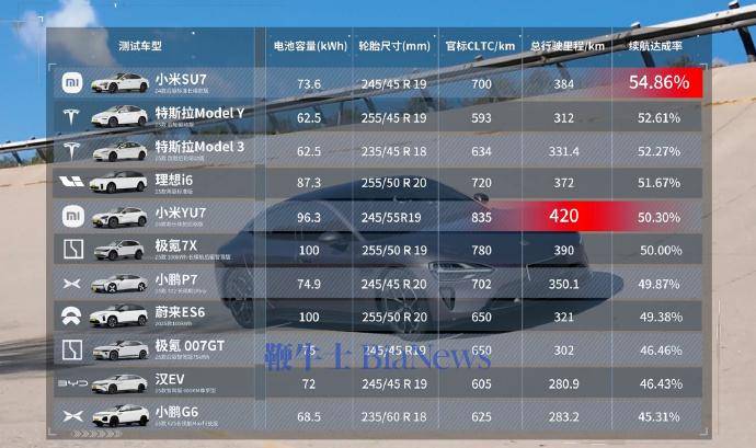 在这样高强度的测试环境下,小米汽车旗下的两款车型表现亮眼。小米YU7凭借出色的续航能力脱颖而出,最终续航里程达到了420公里,在所有参与测试的车辆中续航最长。而小米SU7则在达成率方面表现优异,其达成率高达54.86%,成为达成率最高的车型。