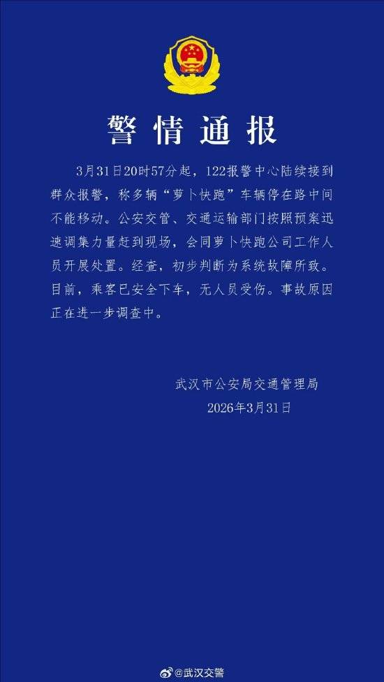 武汉市公安局交通管理局近日发布通报称,3月31日晚间,武汉多个路段出现多辆“萝卜快跑”自动驾驶车辆集体停滞现象。涉事车辆均停在道路中央无法继续行驶,现场未造成人员伤亡,所有乘客已在相关部门协助下安全转移。交管部门联合交通运输局及运营企业第一时间启动应急预案,目前具体技术故障原因仍在深入排查中。