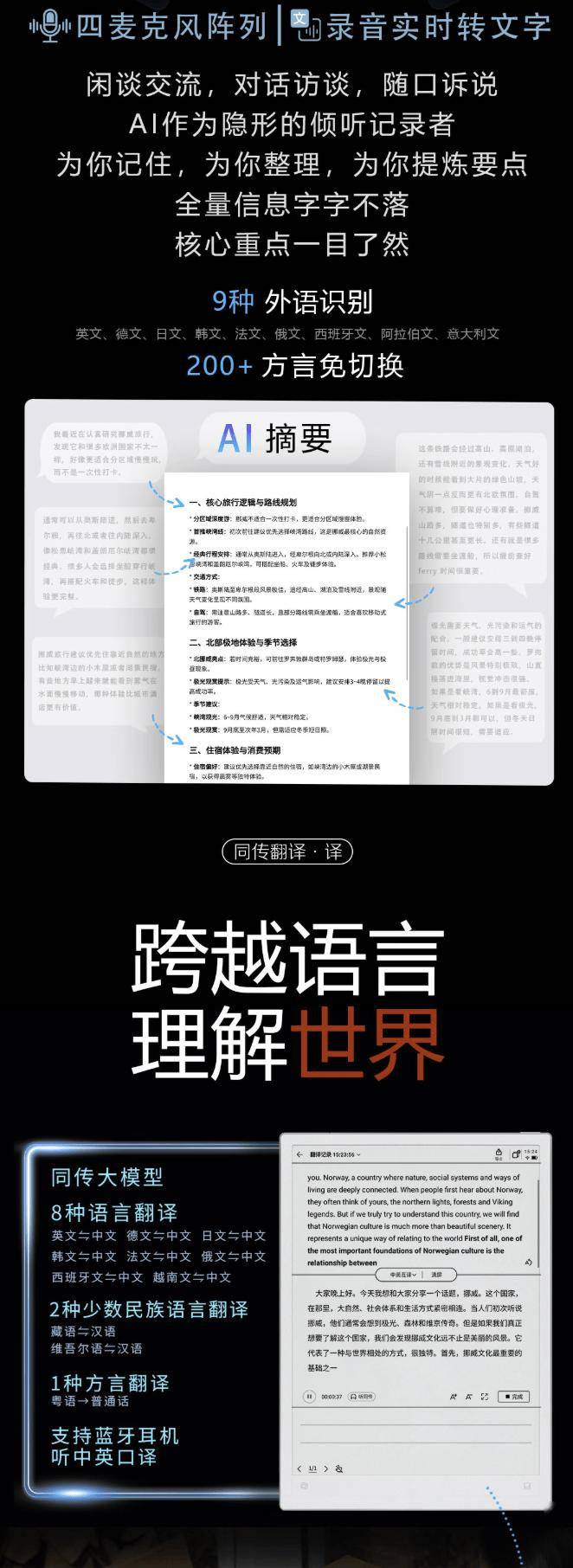 系统层面搭载定制版安卓14,深度整合科大讯飞AI技术栈。核心功能包括智能会议记录(支持实时录音转文字)、多模态笔记融合(可同步手写、语音与文字内容)以及智能摘要生成。这些功能特别针对商务办公场景优化,用户可通过语音指令快速调用不同功能模块。