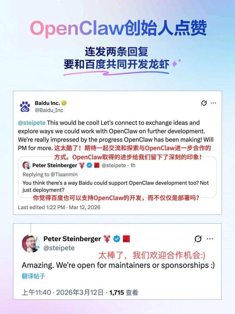 国际开发者社区对此给予高度关注。同日,OpenClaw创始人Peter Steinberger在社交平台连续发布两条动态,盛赞中国AI领域的创新效率,并主动提出与百度开展技术合作。这位知名开发者表示,中国团队在移动端AI应用开发方面展现出的技术敏锐度值得全球同行借鉴。
