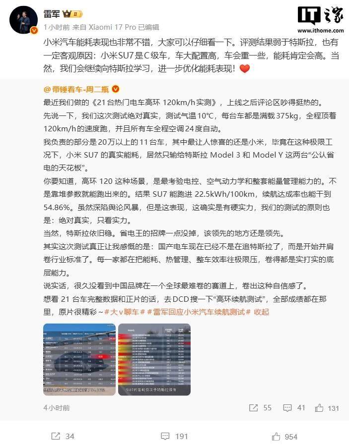 针对近期外界关注的小米SU7能耗评测结果弱于特斯拉的讨论,雷军通过微博作出回应。他指出,小米SU7作为一款C级车,车身尺寸较大且配置丰富,导致整车重量较高,因此能耗表现相对较高属于客观因素。同时,他强调小米汽车始终将优化能耗作为重要目标,未来将继续向特斯拉等行业标杆学习,通过技术创新与工艺改进,持续提升产品的能效水平。